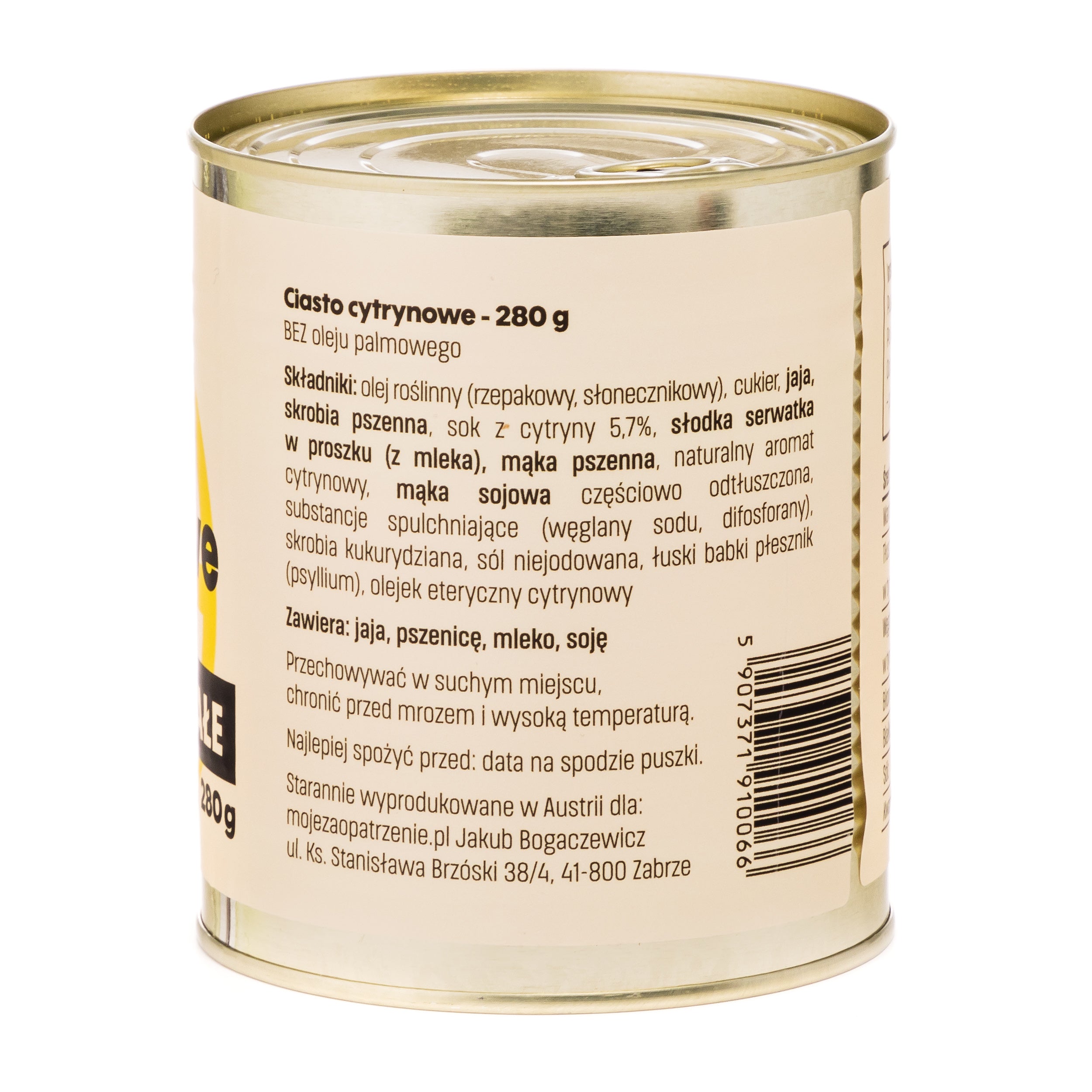 Olej roślinny (rzepakowy, słonecznikowy), cukier, jaja, skrobia pszenna, sok z cytryny 5,7%, słodka serwatka w proszku (z mleka), mąka pszenna, naturalny aromat cytrynowy, mąka sojowa częściowo odtłuszczona, substancje spulchniające (węglany sodu, difosforany), skrobia kukurydziana, sól niejodowana, łuski babki płesznik (psyllium), olejek eteryczny cytrynowy. Zawiera: jaja, pszenicę, mleko, soję.